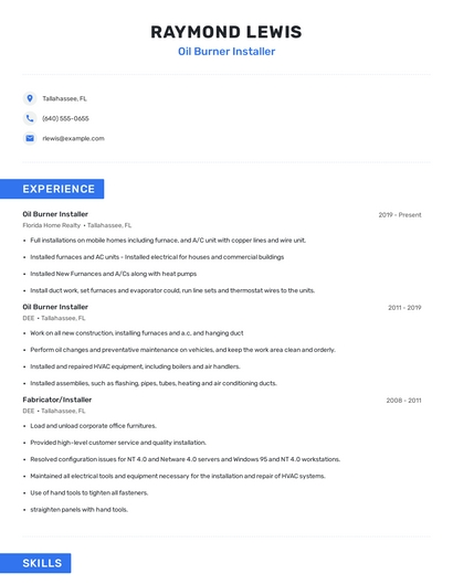 The most important skills for an oil burner installer resume and required skills for an oil burner installer to have include: