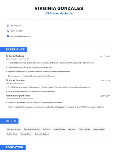 Build a professional oil burner mechanic resume in minutes. Our AI resume writing assistant will guide you through every step of the process, and you can choose from 10+ resume templates to create your oil burner mechanic resume.7. Maintenance Services