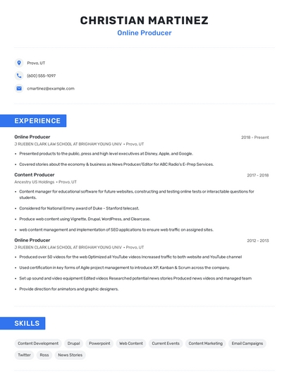 Build a professional online producer resume in minutes. Browse through our resume examples to identify the best way to word your resume. Then choose from 5+ resume templates to create your online producer resume.