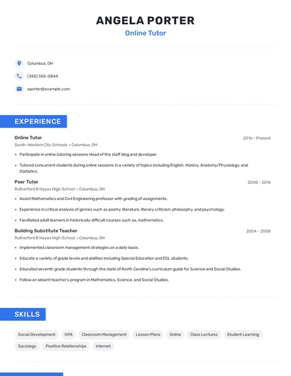 Build a professional online tutor resume in minutes. Browse through our resume examples to identify the best way to word your resume. Then choose from 5+ resume templates to create your online tutor resume.