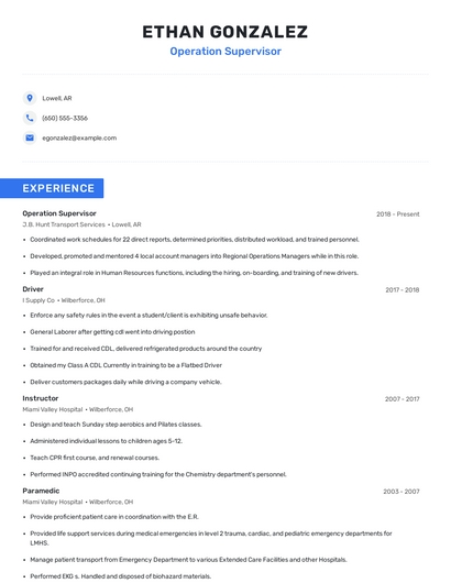 Build a professional operation supervisor resume in minutes. Browse through our resume examples to identify the best way to word your resume. Then choose from 5+ resume templates to create your operation supervisor resume.
