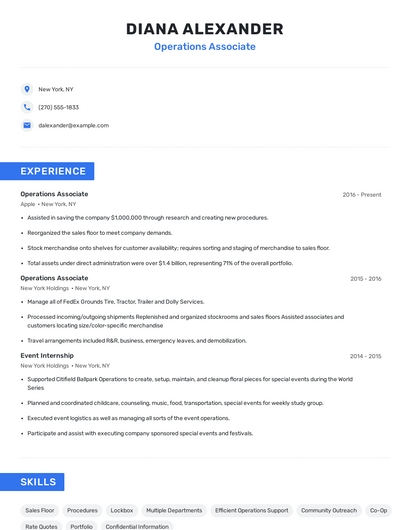 Build a professional operations associate resume in minutes. Browse through our resume examples to identify the best way to word your resume. Then choose from 5+ resume templates to create your operations associate resume.