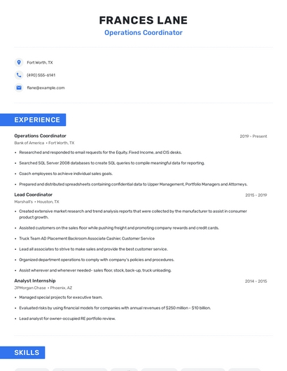 Build a professional operations coordinator resume in minutes. Browse through our resume examples to identify the best way to word your resume. Then choose from 5+ resume templates to create your operations coordinator resume.