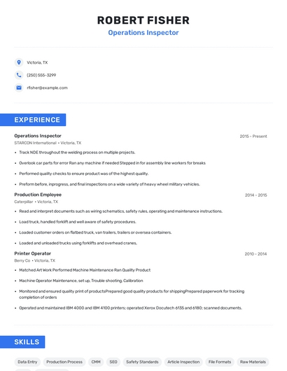 Build a professional operations inspector resume in minutes. Browse through our resume examples to identify the best way to word your resume. Then choose from 5+ resume templates to create your operations inspector resume.