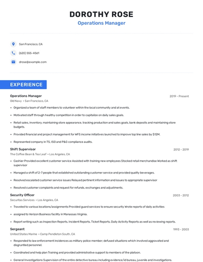 Build a professional operations manager resume in minutes. Browse through our resume examples to identify the best way to word your resume. Then choose from 5+ resume templates to create your operations manager resume.