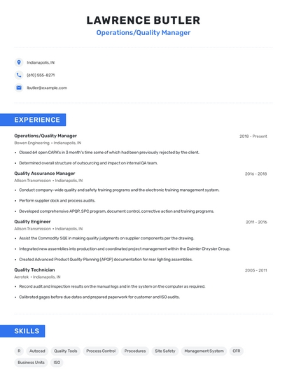 Build a professional operations/quality manager resume in minutes. Browse through our resume examples to identify the best way to word your resume. Then choose from 5+ resume templates to create your operations/quality manager resume.