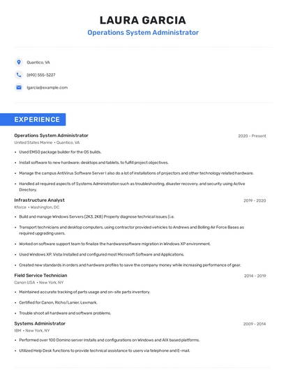 Build a professional operations system administrator resume in minutes. Browse through our resume examples to identify the best way to word your resume. Then choose from 5+ resume templates to create your operations system administrator resume.