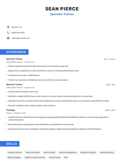 Build a professional operator trainee resume in minutes. Browse through our resume examples to identify the best way to word your resume. Then choose from 5+ resume templates to create your operator trainee resume.