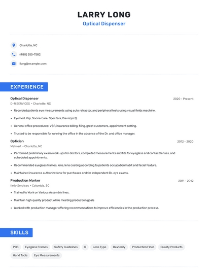 Build a professional optical dispenser resume in minutes. Our AI resume writing assistant will guide you through every step of the process, and you can choose from 10+ resume templates to create your optical dispenser resume.7. Insurance Claims