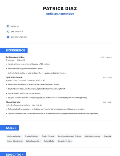 Build a professional optician apprentice resume in minutes. Browse through our resume examples to identify the best way to word your resume. Then choose from 5+ resume templates to create your optician apprentice resume.