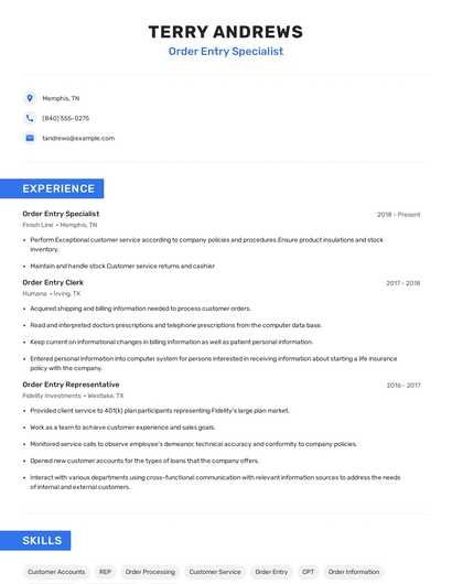 Build a professional order entry specialist resume in minutes. Browse through our resume examples to identify the best way to word your resume. Then choose from 5+ resume templates to create your order entry specialist resume.