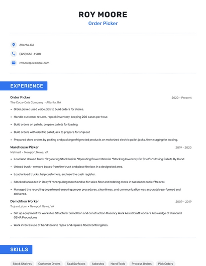 Build a professional order picker resume in minutes. Browse through our resume examples to identify the best way to word your resume. Then choose from 5+ resume templates to create your order picker resume.