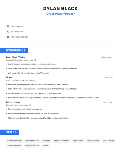 Build a professional order picker/packer resume in minutes. Browse through our resume examples to identify the best way to word your resume. Then choose from 5+ resume templates to create your order picker/packer resume.