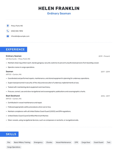 Build a professional ordinary seaman resume in minutes. Browse through our resume examples to identify the best way to word your resume. Then choose from 5+ resume templates to create your ordinary seaman resume.
