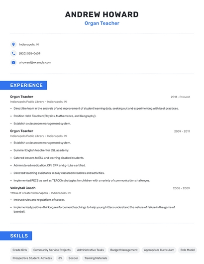 Build a professional organ teacher resume in minutes. Our AI resume writing assistant will guide you through every step of the process, and you can choose from 10+ resume templates to create your organ teacher resume.What skills help Organ Teachers find jobs?