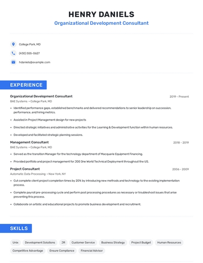Build a professional organizational development consultant resume in minutes. Browse through our resume examples to identify the best way to word your resume. Then choose from 5+ resume templates to create your organizational development consultant resume.