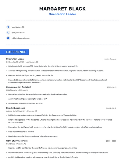 Build a professional orientation leader resume in minutes. Browse through our resume examples to identify the best way to word your resume. Then choose from 5+ resume templates to create your orientation leader resume.