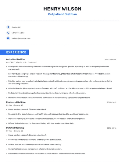 Build a professional outpatient dietitian resume in minutes. Browse through our resume examples to identify the best way to word your resume. Then choose from 5+ resume templates to create your outpatient dietitian resume.