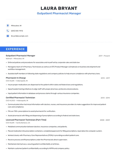 Build a professional outpatient pharmacist manager resume in minutes. Browse through our resume examples to identify the best way to word your resume. Then choose from 5+ resume templates to create your outpatient pharmacist manager resume.