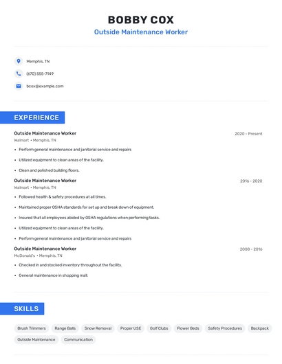 Build a professional outside maintenance worker resume in minutes. Our AI resume writing assistant will guide you through every step of the process, and you can choose from 10+ resume templates to create your outside maintenance worker resume.7. Mowers