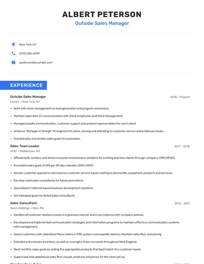 Build a professional outside sales manager resume in minutes. Browse through our resume examples to identify the best way to word your resume. Then choose from 5+ resume templates to create your outside sales manager resume.