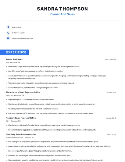 Build a professional owner and sales resume in minutes. Browse through our resume examples to identify the best way to word your resume. Then choose from 5+ resume templates to create your owner and sales resume.