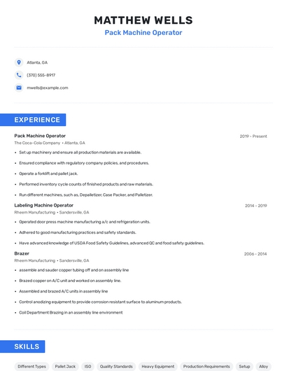 Build a professional pack machine operator resume in minutes. Browse through our resume examples to identify the best way to word your resume. Then choose from 5+ resume templates to create your pack machine operator resume.