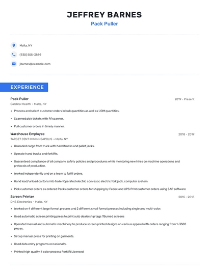 Build a professional pack puller resume in minutes. Our AI resume writing assistant will guide you through every step of the process, and you can choose from 10+ resume templates to create your pack puller resume.7. Inventory Control