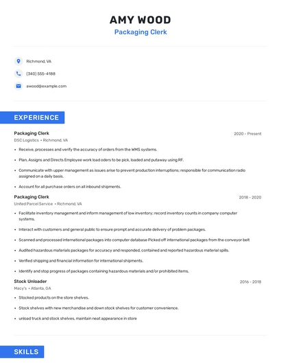 Build a professional packaging clerk resume in minutes. Browse through our resume examples to identify the best way to word your resume. Then choose from 5+ resume templates to create your packaging clerk resume.