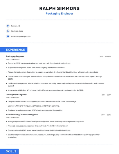 Build a professional packaging engineer resume in minutes. Browse through our resume examples to identify the best way to word your resume. Then choose from 5+ resume templates to create your packaging engineer resume.