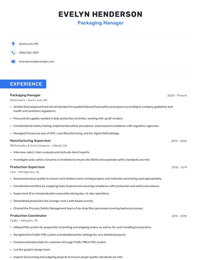Build a professional packaging manager resume in minutes. Browse through our resume examples to identify the best way to word your resume. Then choose from 5+ resume templates to create your packaging manager resume.