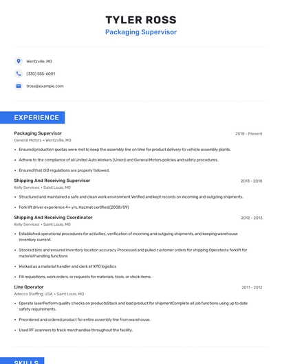 Build a professional packaging supervisor resume in minutes. Browse through our resume examples to identify the best way to word your resume. Then choose from 5+ resume templates to create your packaging supervisor resume.