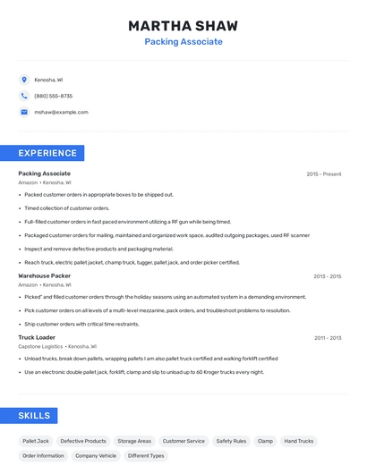 Build a professional packing associate resume in minutes. Browse through our resume examples to identify the best way to word your resume. Then choose from 5+ resume templates to create your packing associate resume.