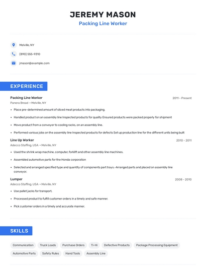 Build a professional packing line worker resume in minutes. Browse through our resume examples to identify the best way to word your resume. Then choose from 5+ resume templates to create your packing line worker resume.