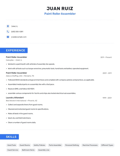 Build a professional paint roller assembler resume in minutes. Browse through our resume examples to identify the best way to word your resume. Then choose from 5+ resume templates to create your paint roller assembler resume.