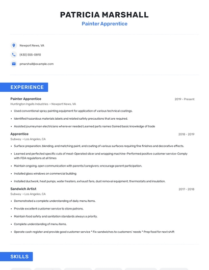 Build a professional painter apprentice resume in minutes. Browse through our resume examples to identify the best way to word your resume. Then choose from 5+ resume templates to create your painter apprentice resume.