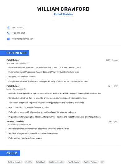 Build a professional pallet builder resume in minutes. Browse through our resume examples to identify the best way to word your resume. Then choose from 5+ resume templates to create your pallet builder resume.