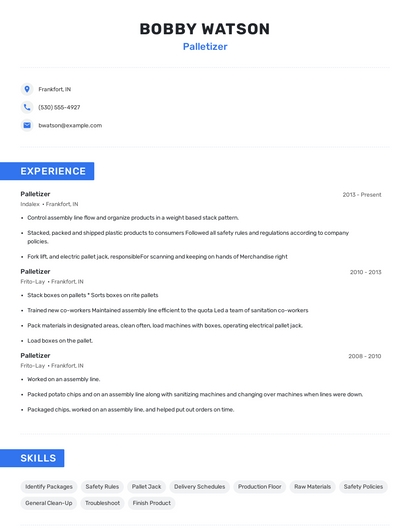 Build a professional palletizer resume in minutes. Browse through our resume examples to identify the best way to word your resume. Then choose from 5+ resume templates to create your palletizer resume.