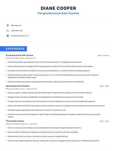 Build a professional paraprofessional aide teacher resume in minutes. Browse through our resume examples to identify the best way to word your resume. Then choose from 5+ resume templates to create your paraprofessional aide teacher resume.