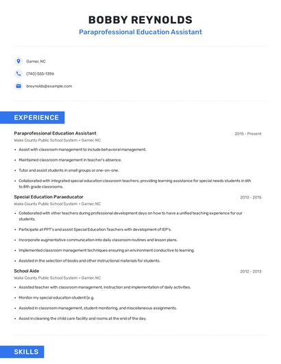 Build a professional paraprofessional education assistant resume in minutes. Browse through our resume examples to identify the best way to word your resume. Then choose from 5+ resume templates to create your paraprofessional education assistant resume.