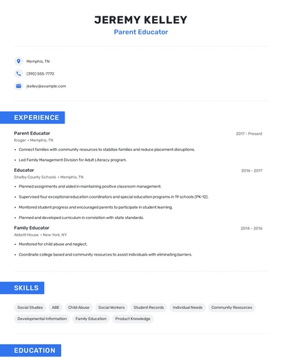 Build a professional parent educator resume in minutes. Browse through our resume examples to identify the best way to word your resume. Then choose from 5+ resume templates to create your parent educator resume.
