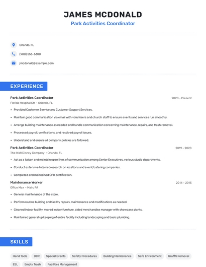 Choose from 10+ customizable park activities coordinator resume templates