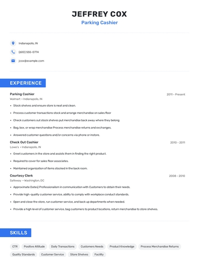 Build a professional parking cashier resume in minutes. Browse through our resume examples to identify the best way to word your resume. Then choose from 5+ resume templates to create your parking cashier resume.