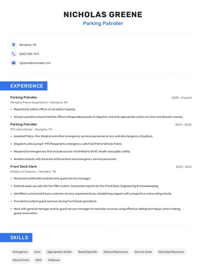 Build a professional parking patroller resume in minutes. Browse through our resume examples to identify the best way to word your resume. Then choose from 5+ resume templates to create your parking patroller resume.