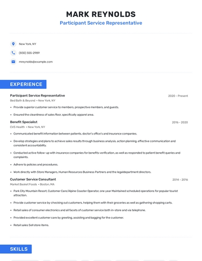 Build a professional participant service representative resume in minutes. Browse through our resume examples to identify the best way to word your resume. Then choose from 5+ resume templates to create your participant service representative resume.