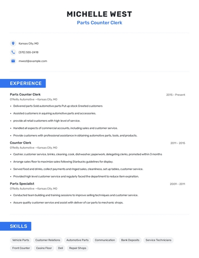 Build a professional parts counter clerk resume in minutes. Browse through our resume examples to identify the best way to word your resume. Then choose from 5+ resume templates to create your parts counter clerk resume.