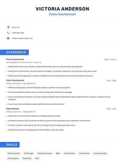Build a professional parts counterman resume in minutes. Browse through our resume examples to identify the best way to word your resume. Then choose from 5+ resume templates to create your parts counterman resume.