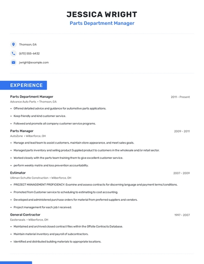 Build a professional parts department manager resume in minutes. Browse through our resume examples to identify the best way to word your resume. Then choose from 5+ resume templates to create your parts department manager resume.
