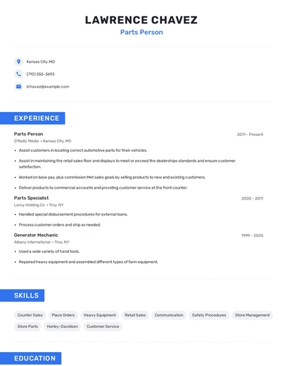 Build a professional parts person resume in minutes. Browse through our resume examples to identify the best way to word your resume. Then choose from 5+ resume templates to create your parts person resume.