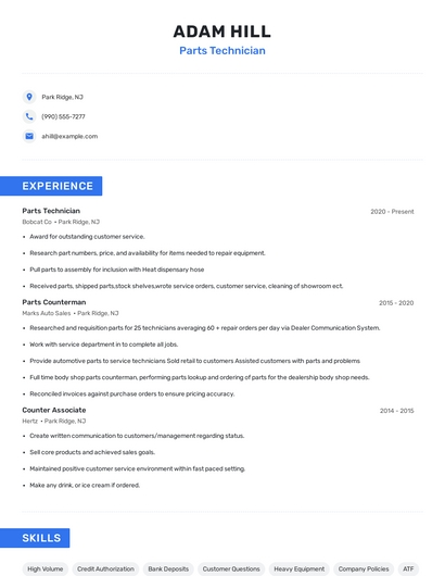 Build a professional parts technician resume in minutes. Our AI resume writing assistant will guide you through every step of the process, and you can choose from 10+ resume templates to create your parts technician resume.7. Part Numbers